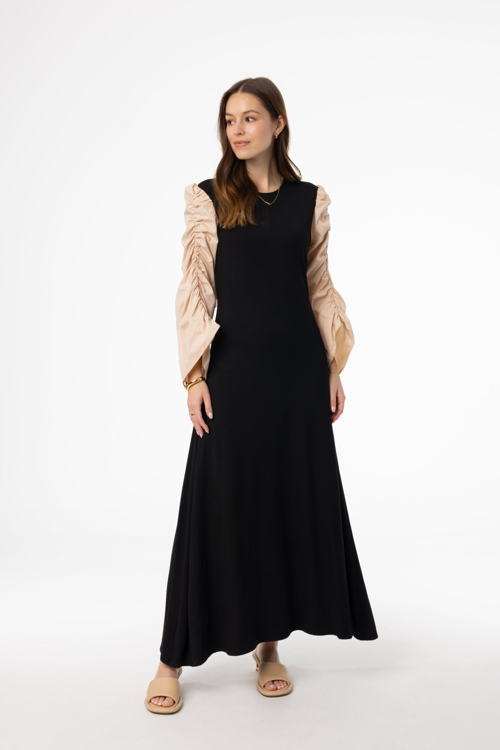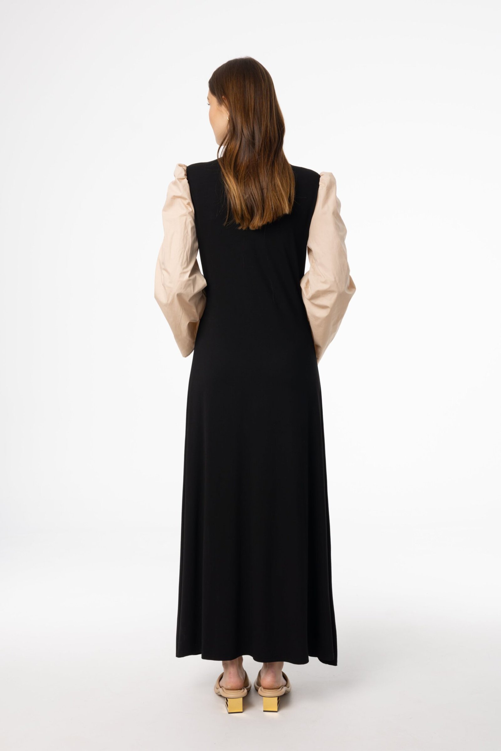 Embrace a sleek and sophisticated look with this maxi dress. The unique color blocking and thoughtful detailing add depth and style to a classic silhouette.