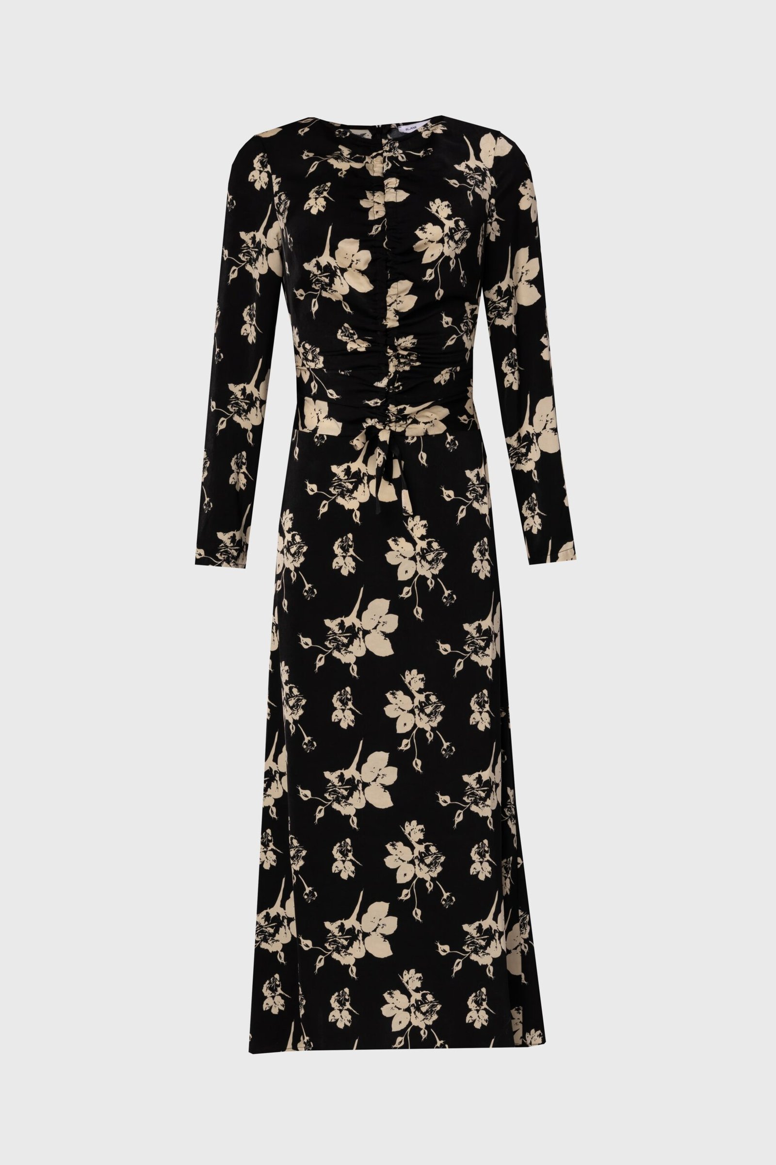 A dress that knows how to make an entrance. Black florals keep it timeless. ruching gives it that extra sculpted touch. and the maxi length makes every step feel like a moment. Wear it sleek with heels. or go for an effortless feel with flat sandals and a crossbody bag. Either way. this one does all the work—you just show up.
